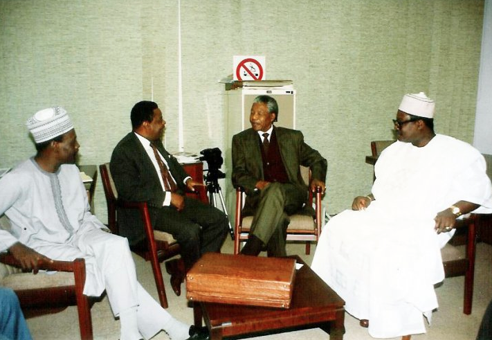 With Madiba Nelson Mandela at the First ANC Congress inside South Africa in Durban following his release from prison in 1991. Showing from left Amb. Babagana Kingibe – Nat. Chairman SDP,Amb. Olisameka, Madiba Nelson Mandela and Chief Tom Ikimi- Nat. Chairman NRC.