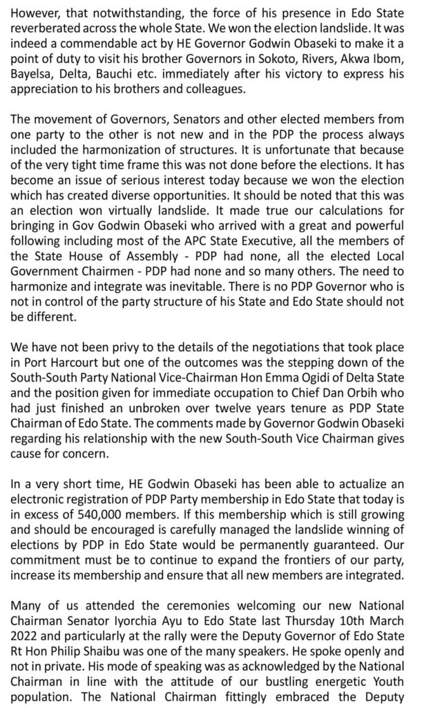 We, elders and critical leaders of PDP in Edo State, having become aware of some political disagreements within the membership of our great party in Edo State, consider it urgent that all groups sheath their swords and respect Party leadership intervention at the highest level. We have been disturbed by the recent open confrontations between H.E. Governor Nyesom Wike of Rivers State and our Governor, H.E. Godwin Obaseki of Edo State. It is absolutely necessary for us to bring all this to an end immediately and ensure the smooth operation of a united South-Southern block of PDP states.