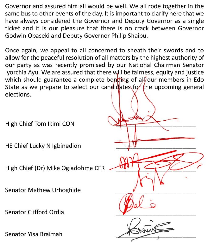 Once again, we appeal to all concerned to sheath their swords and to allow for the peaceful resolution of all matters by the highest authority of our party as was recently promised by our National Chairman, Senator Iyorchia Ayu. We are assured that there will be fairness, equity and justice which should guarantee a complete bonding of all our members in Edo State as we prepare to select our candidates for the upcoming general elections.